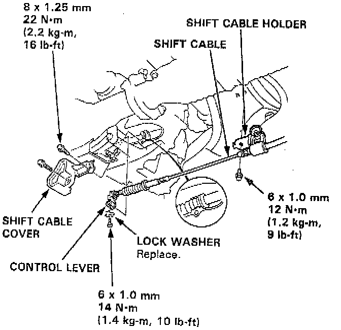 6. Remove the control lever from the control shaft, then remove the shift cable. Take care not to bend the cable when removing/installing it.