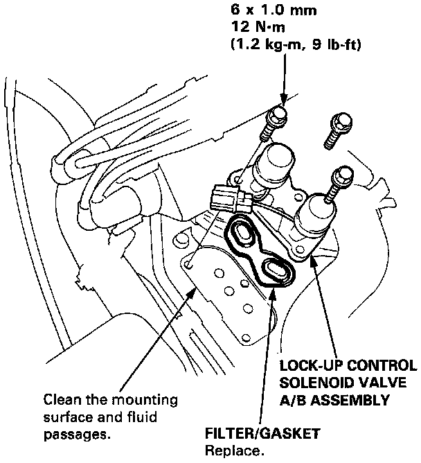 3. Clean the mounting surface and fluid passages of the lock-up control solenoid valve A/B assembly, and install a new lock-up control solenoid valve A/B assembly with a new filter/gasket.