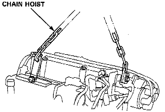 12. Install the bolts in the cylinder head and attach a chain hoist to the bolts, then lift the engine slightly to unload the engine and transmission mounts.