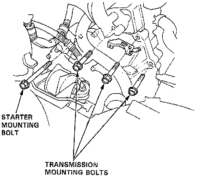 16. Remove the three upper transmission mounting bolts and the lower starter mounting bolt.