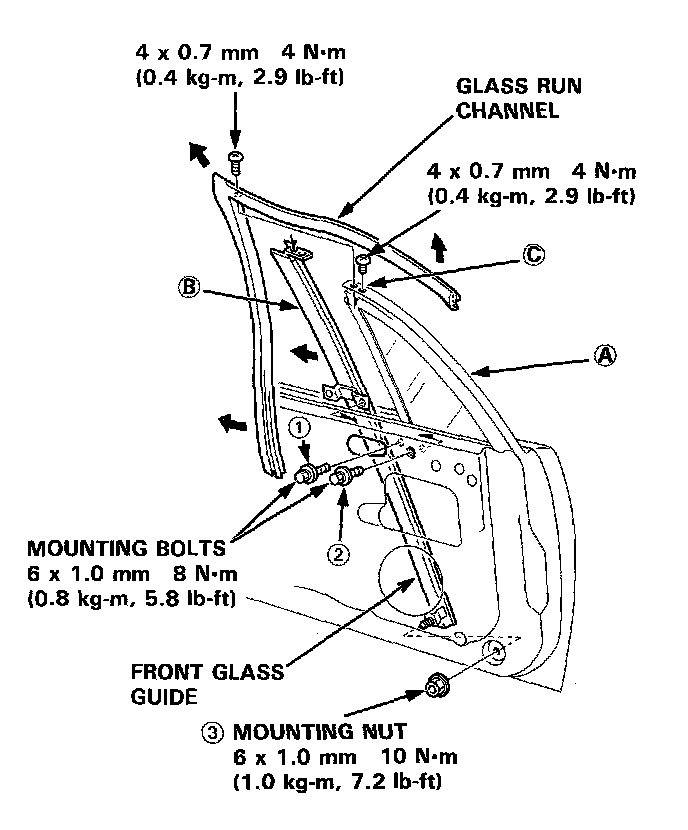^ When installing the front glass guide, tighten the mounting screw, then install the mounting bolt temporarily. Align the front glass guide properly, then tighten the mounting bolts.