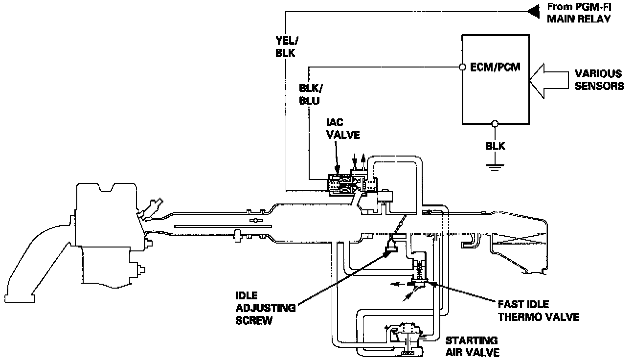 2. When the coolant temperature is low, the IAC valve is opened to obtain the proper fast idle speed. The amount of bypassed air is thus controlled in relation to the engine coolant temperature.