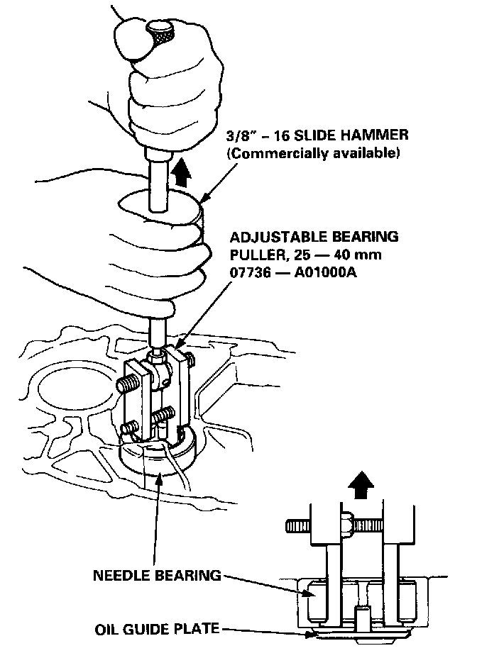 2. Remove the needle bearing with the special tool, then remove the oil guide plate.