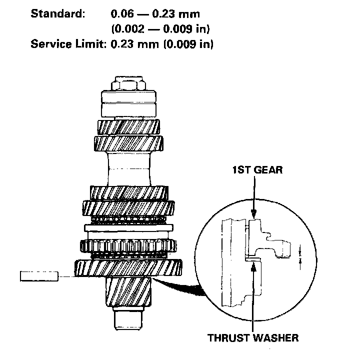 2. If the clearance exceeds the service limit, measure the thicknesses of 1st gear and thrust washer.