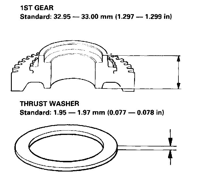 - If the thicknesses of 1st gear and thrust washer are less than the standard, replace with a new one.