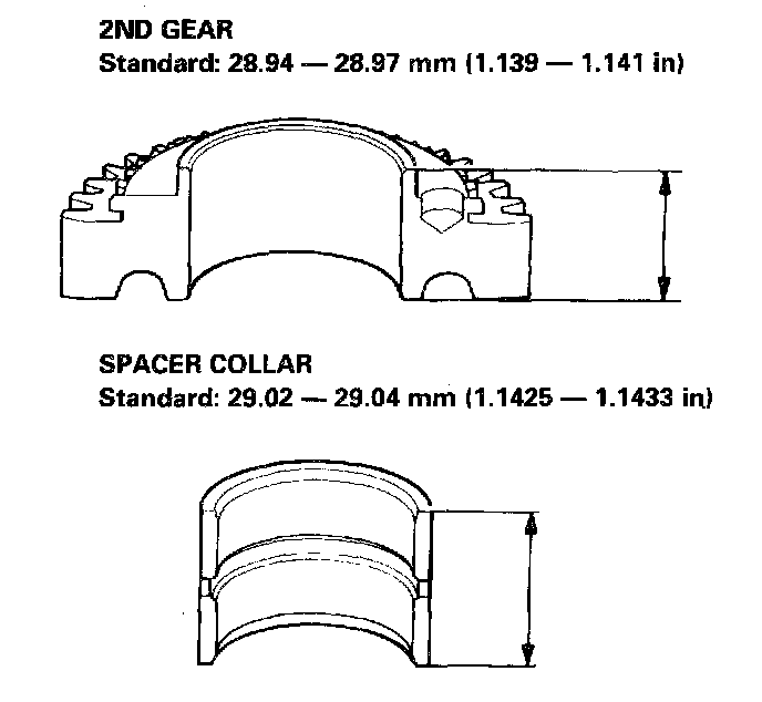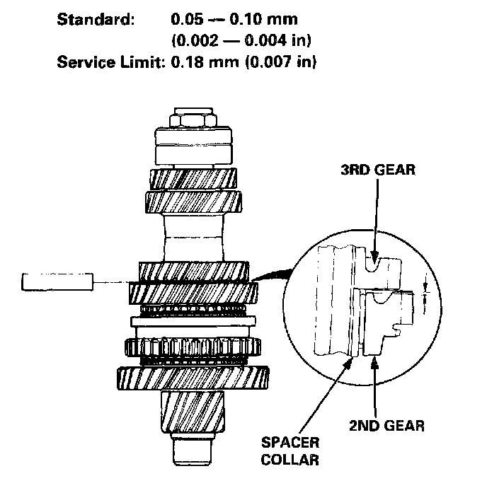 4. If the clearance exceeds the service limit, measure the thicknesses of 2nd gear and spacer collar.