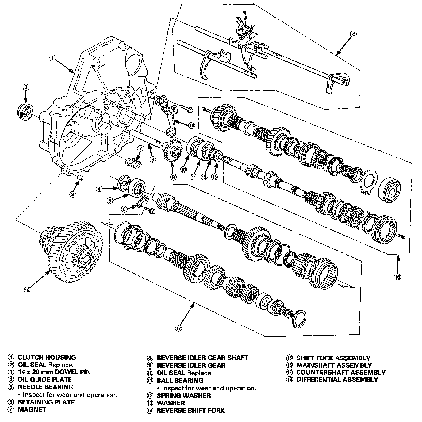 - Always clean the magnet (7) whenever the transmission housing is disassembled.