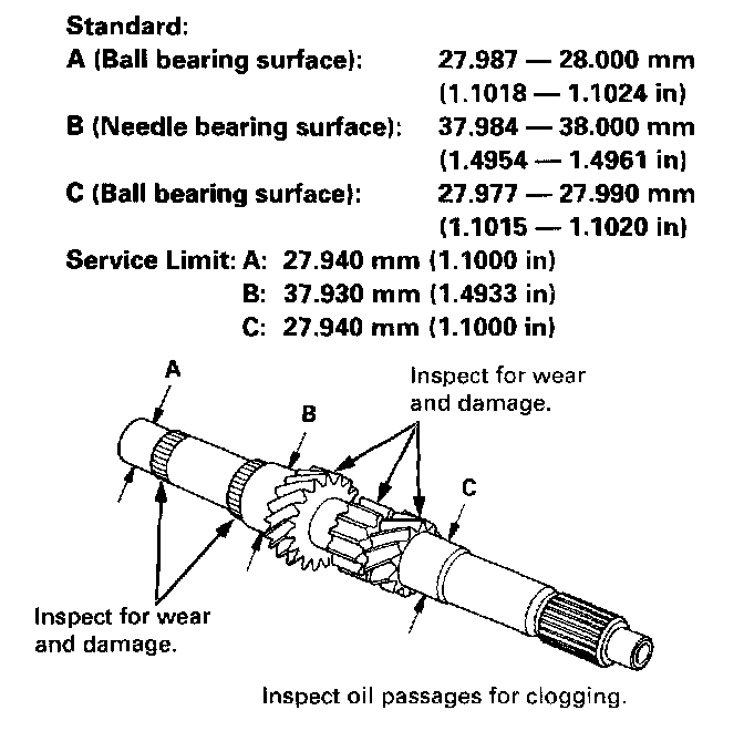 1. Inspect the gear surface and bearing surface for wear and damage, then measure the mainshaft at points A, B, and C.