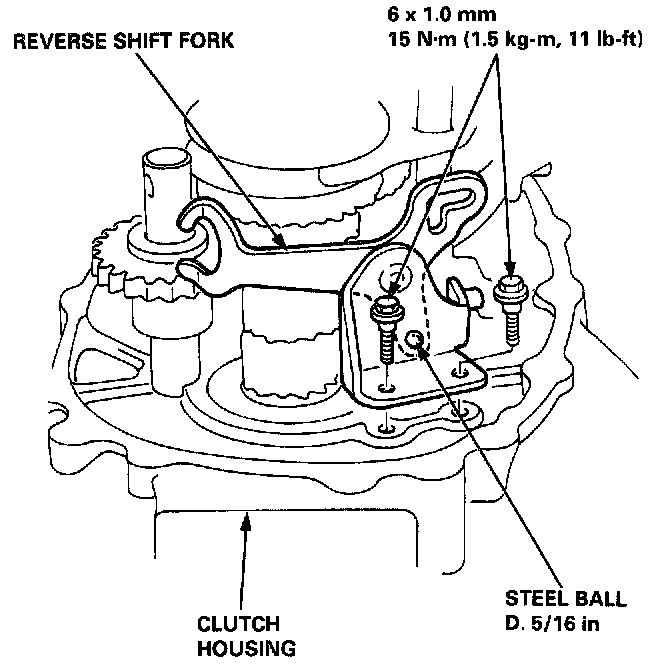 5. Install the reverse shift fork in the clutch housing with the 5th/reverse shift piece pin positioned in the slot of the reverse shift fork.