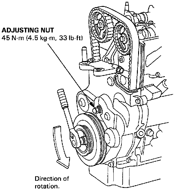 5. Rotate the crankshaft counterclockwise 3-teeth on the camshaft pulley, then reloosen the adjusting nut to create tension on the timing belt.