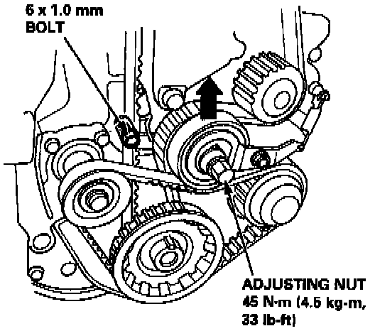 10. Lock the timing belt adjuster arm in place by installing one of the 6 x 1.0 mm bolts.