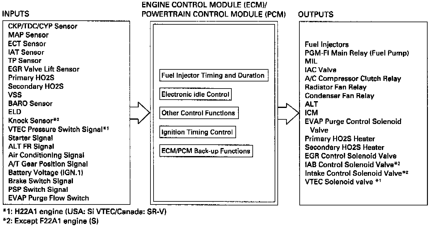 - Fuel cut-off action also takes place when engine speed exceeds F22A1 (S): 6,600 rpm, H23A1 (USA: Si/Canada: SR): 6,800 rpm or H22A1 (USA: Si VTEC/Canada: SR-V): 7,700 rpm, regardless of the position of the throttle valve, to protect the engine from over-revving.