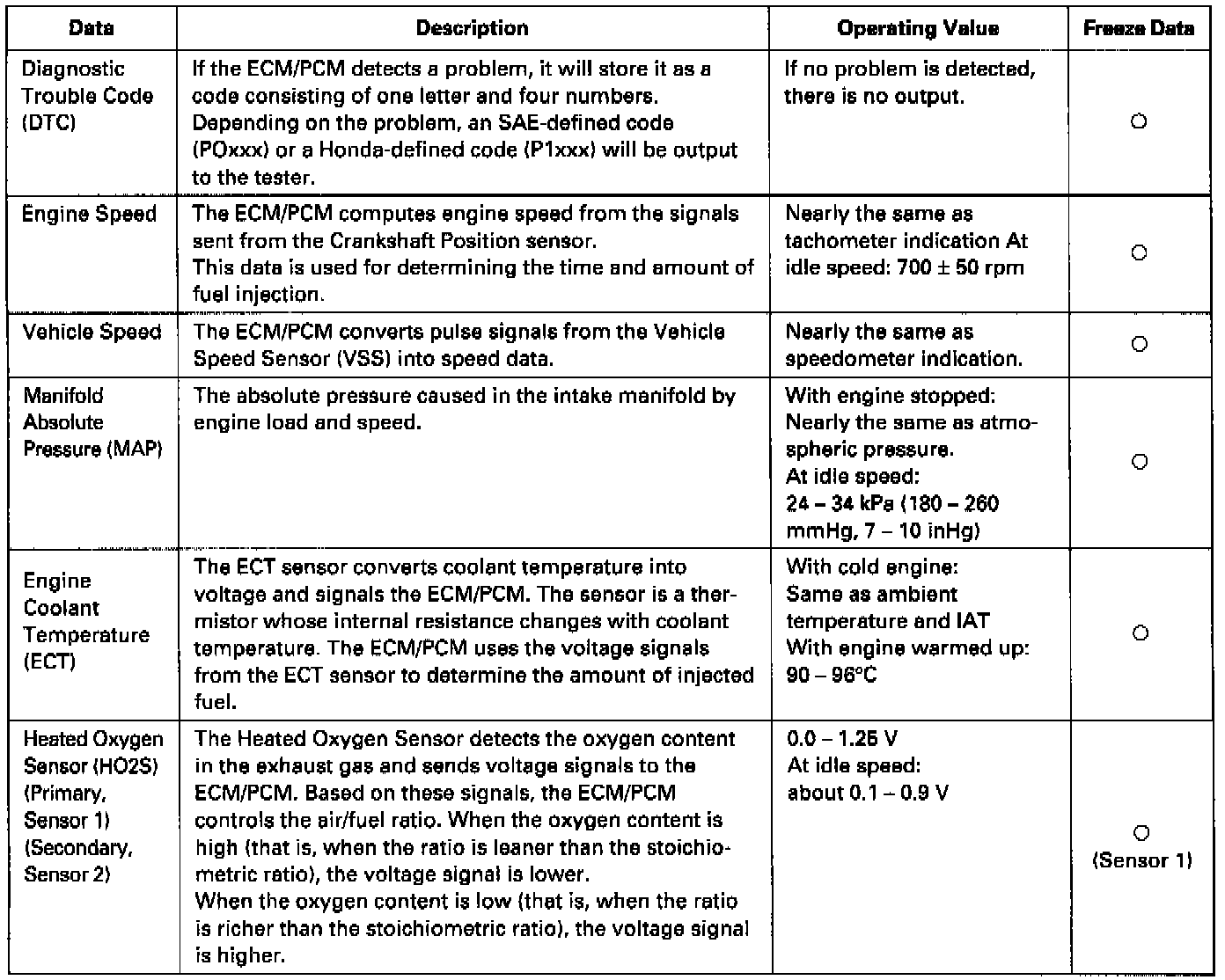 By connecting the OBD-II scan tool or the Honda PGM Tester to the 16P data link connector (DLC), various data can be retrieved from the ECM/PCM. The items listed in the image conform to the SAE recommended practice.