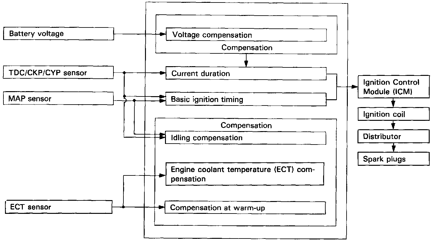 The Programmed Ignition (PGM-IG) used in this Engine provides optimum control of Ignition timing. A microcomputer determines the timing in response to Engine speed and Manifold vacuum. The input signals are transmitted by the Top Dead Center/Crankshaft Position/Cylinder Position (TDC/CKP/CYP) Sensor, Throttle Position (TP) Sensor, Engine Coolant Temperature (ECT) Sensor, and Manifold Absolute Pressure (MAP) Sensor. This system, which is not dependent on a Governor or Vacuum Diaphragm, is capable of setting lead angles with complicated characteristics which cannot be provided by conventional Governors or Diaphragms.