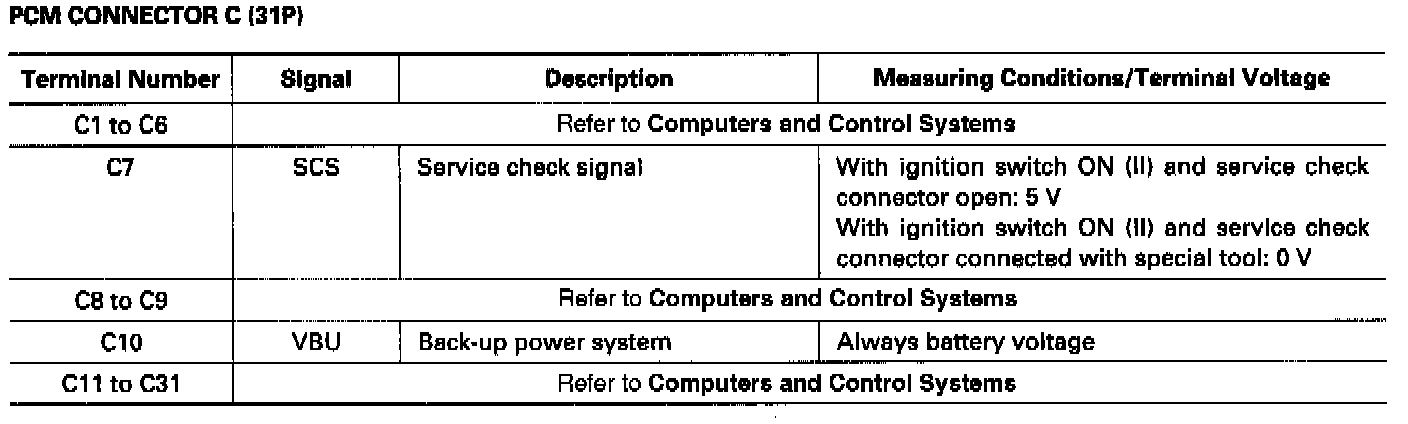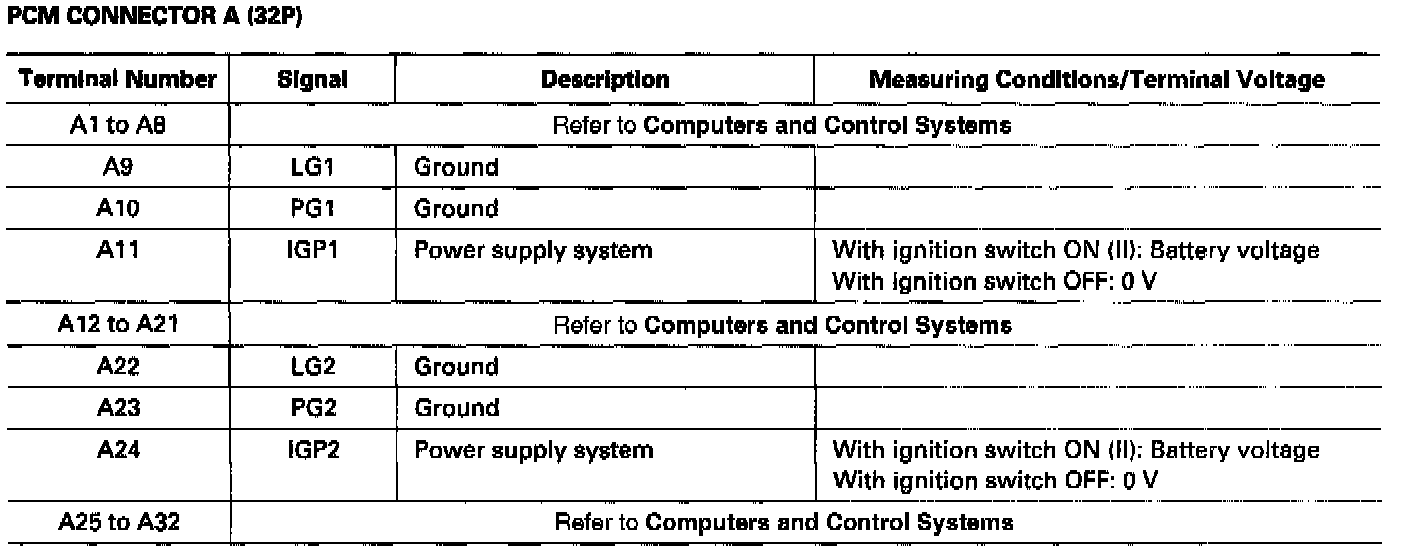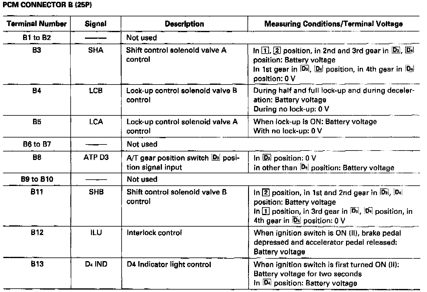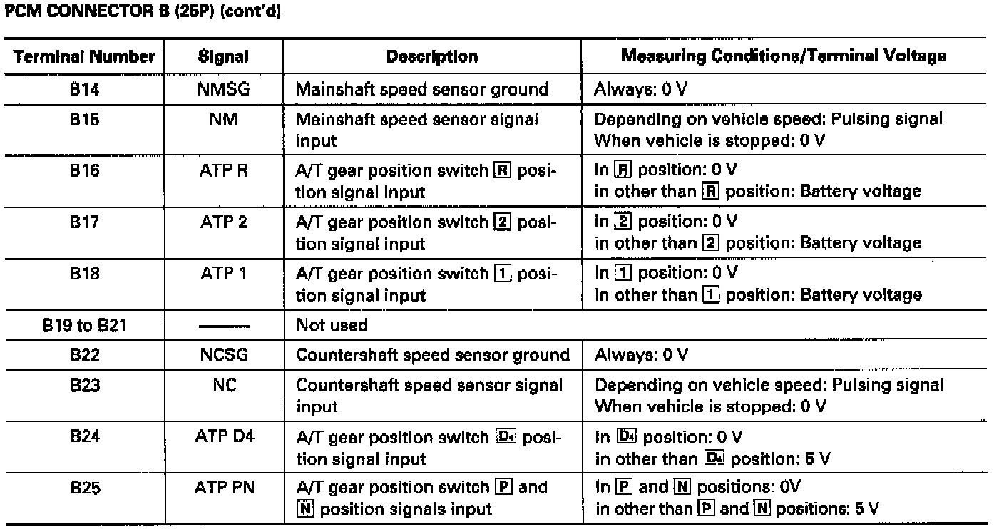 The PCM terminal voltage and measuring conditions are shown for the connector terminals that are related to the A/T control system. The other PCM terminal voltage and measuring conditions are described in Normal Scan Data Values under Computers and Control Systems. Testing and Inspection
