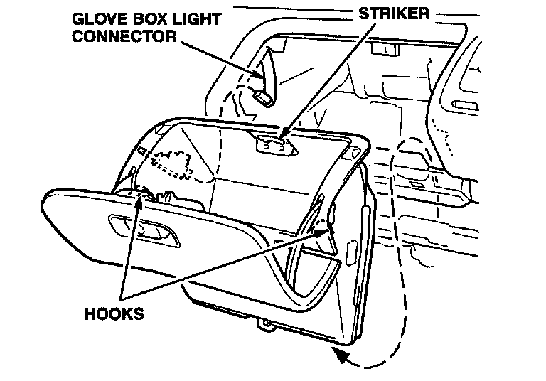 6. Release the hooks. Pull down on the striker to pull the glove box out, disconnect the glove box light connector, and remove the glove box from the dashboard.