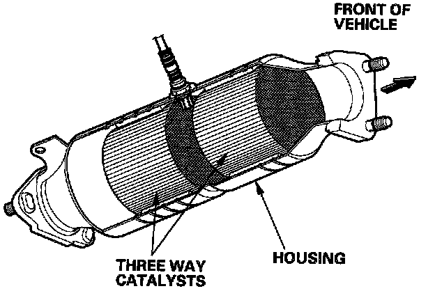 ) converts hydrocarbons (HC), carbon monoxide (CO), and oxides of nitrogen (NOx) in the exhaust gas to carbon dioxide (CO2), dinitrogen (N2), and water vapor.