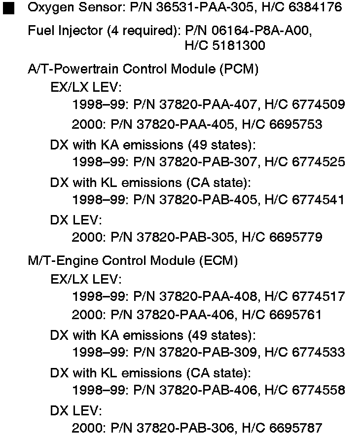 For 1998-2000 models only: Compare the vehicle's ECM/PCM part number to PARTS INFORMATION. If the numbers do not match, replace the ECM/PCM.