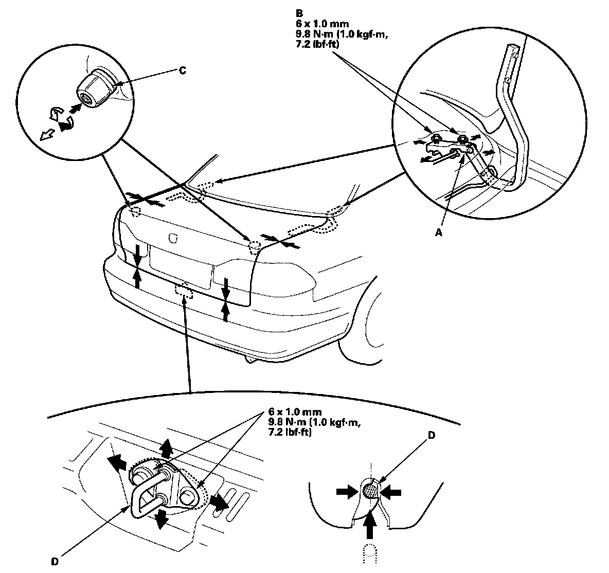 - Turn the trunk lid edge cushions in or out (C), as necessary, to make the trunk lid fit flush with the body at the rear and side edges.
