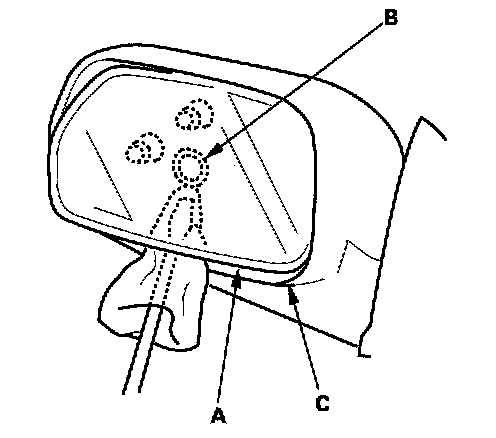 1. Pry the mirror holder (A) out from the bottom until you can see the pivot (B) of the actuator, then detach the pivot using a flat-tip screwdriver. Take care not to scratch the mirror (C).