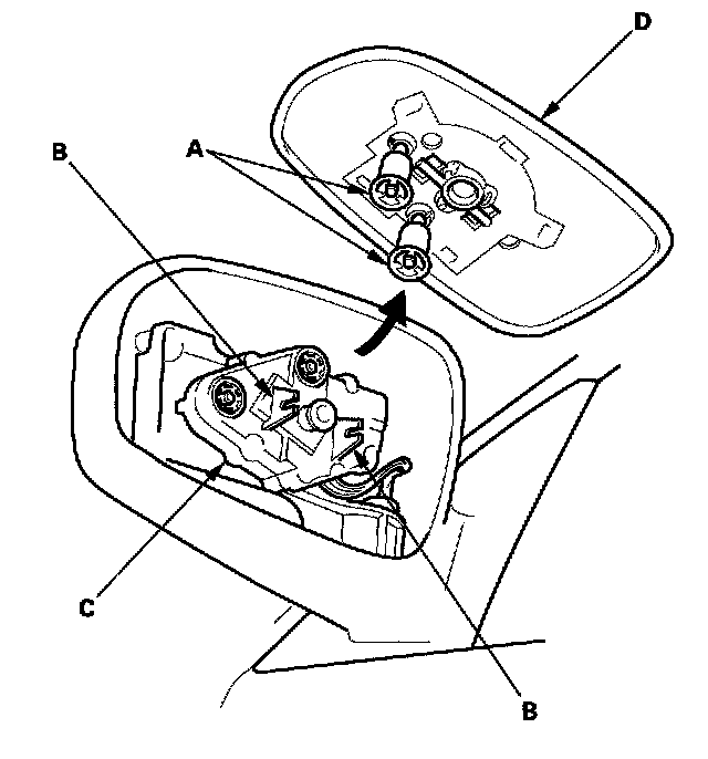 2. Remove the actuator shafts (A) and release the hooks (B) from the actuator (C), then remove the mirror holder (D). If equipped, disconnect the mirror defogger terminals.