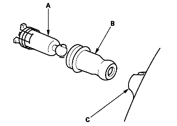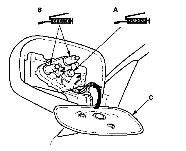 3. Remove the actuator shafts (A) and rubber boots (B) from the mirror holder (C). Check the actuator shaft and rubber boot for damage or deterioration, and replace them if necessary.