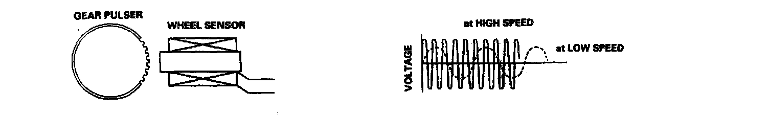 Wheel SensorThe wheel sensors are the magnetic contact less type. As the gear purser teeth rotate past the wheel sensor's magnetic coil, AC current is generated. The AC frequency changes in accordance with the wheel speed. The ABS/TCS control unit detects the wheel sensor signal frequency and thereby detects the wheel speed.