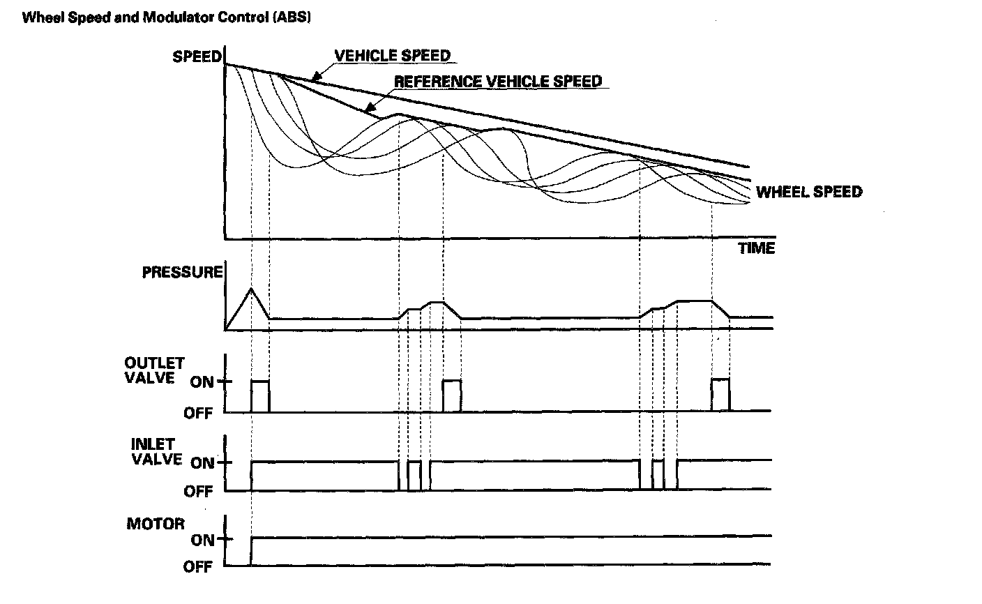 When the wheel speed drops sharply below the vehicle speed, the outlet valve opens momentarily to reduce the caliper fluid pressure. The pump motor starts at this time. As the wheel speed is restored, the inlet valve opens momentarily to increase the caliper fluid pressure.