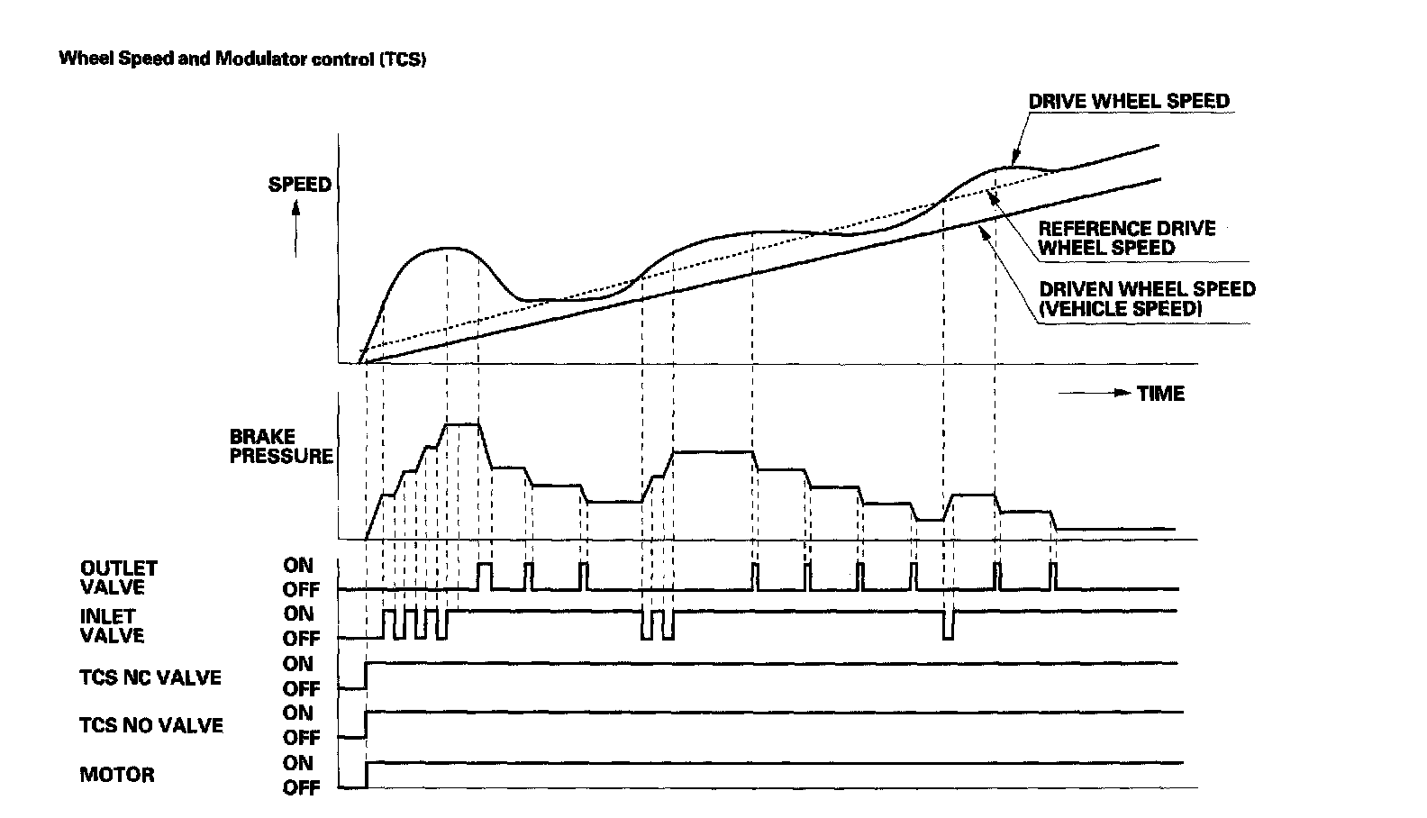 When the front wheel speed rises sharply above the vehicle speed, the TCS NC valve opens, the TCS NO valve closes, and the pump motor starts to intensify the front caliper fluid pressure. When the wheel speed drops, the front inlet valve closes momentarily to retain the front caliper fluid pressure. When the wheel speed drops further, the front outlet valve opens momentarily to reduce the front caliper fluid pressure.