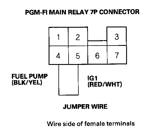 4. Connect the PGM-FI main relay 7P connector terminals No.4 and No. 5 with a jumper wire.