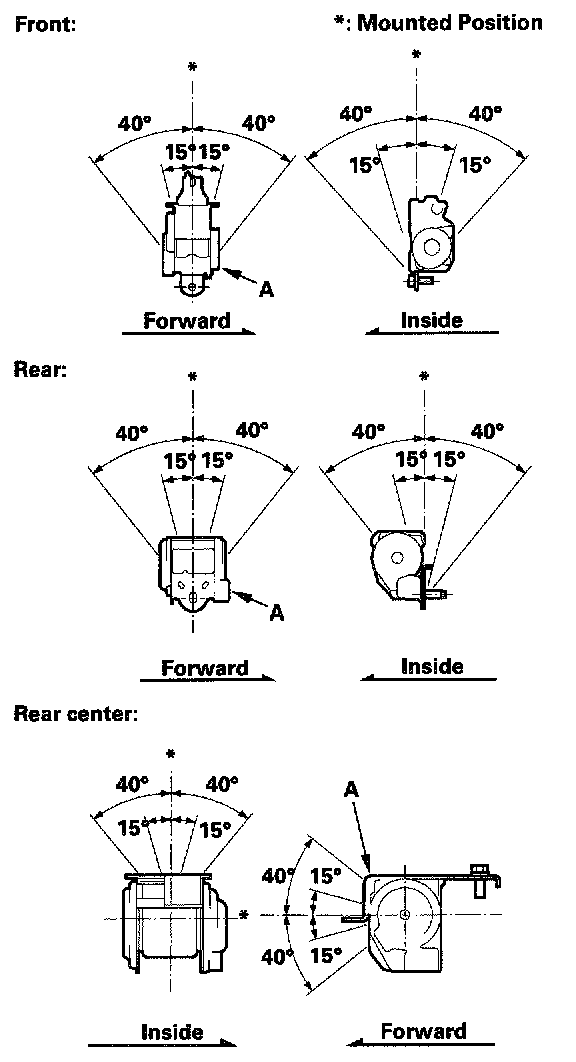 2. Make sure the seat belt does not lock when the retractor (A) is leaned slowly up to 15° from the mounted position. The seat belt should lock when the retractor is leaned over 40°. Do not attempt to disassemble the retractor.