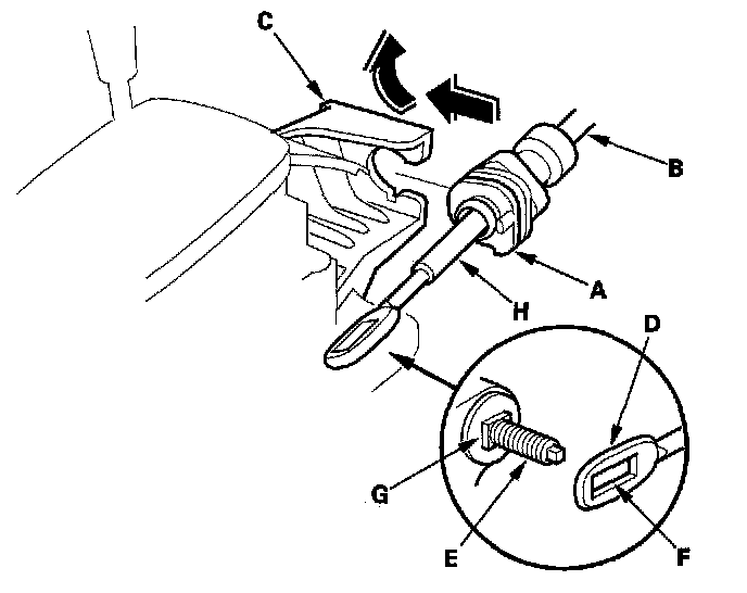 9. Rotate the socket holder (A) on the shift cable (B) counterclockwise a quarter turn, then slide the holder onto the shift lever bracket base (C). Install the shift cable end (D) over the mounting stud (E) by aligning its square hole (F) with the square shape (G) at the bottom of the stud. Rotate the holder clockwise a quarter turn to secure the shift cable.