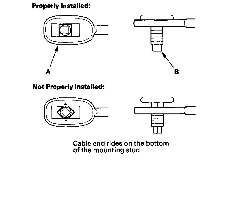 10. Verify that the shift cable end (A) is properly installed on the mounting stud (B).