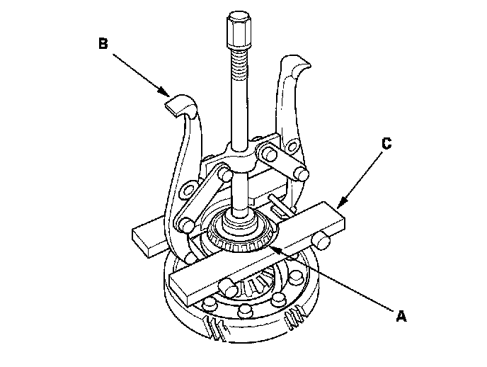 2. Remove the carrier bearing (A) with a commercially-available bearing puller (B) and bearing separator (C).