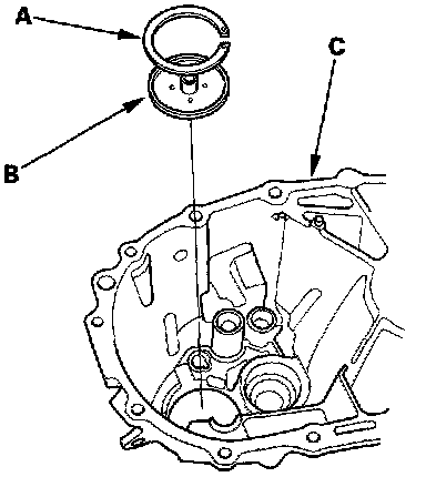 1. Remove the 78 mm shim (A) and oil guide plate (B) from the transmission housing (C).