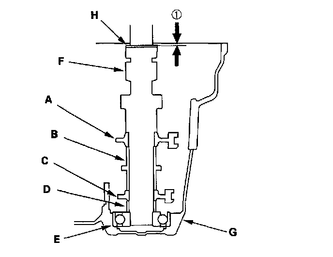 2. Install the 3rd/4th synchro hub (A), the spacer collar (B), the 5th synchro hub (C), the spacer (D), and ball bearing (E) on the mainshaft (F), then install the assembled mainshaft in the transmission housing (G).