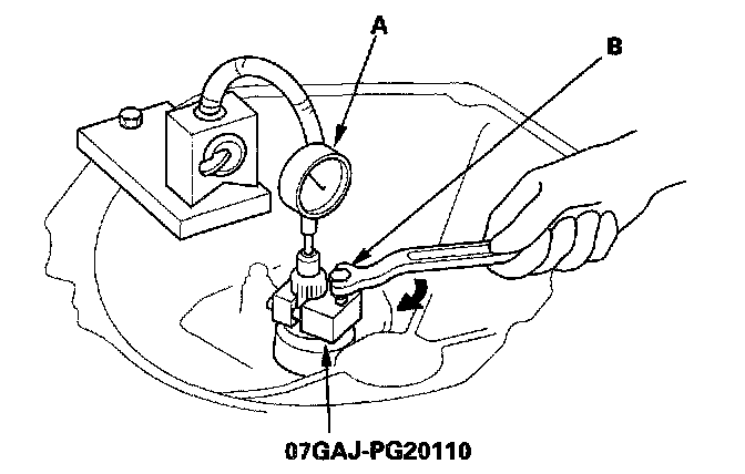 18. Turn the mainshaft holder bolt (B) clockwise; stop turning when the dial gauge (A) has reached its maximum movement. The reading on the dial gauge is the amount of mainshaft end play.