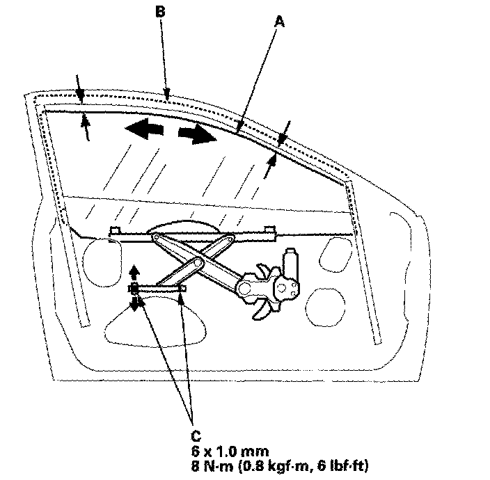 4. Loosen the roller guide bolts (C), and adjust the glass (A) so it is parallel with the glass run channel (B).