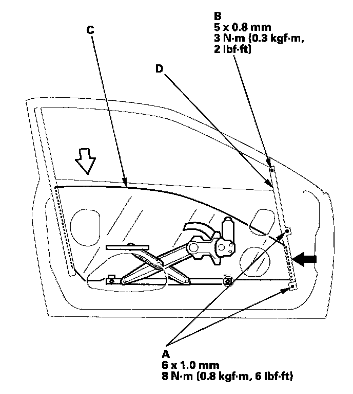 7. Push the front lower channel (D) against the glass (C) while you tighten the mounting bolts (A) and nut (B).