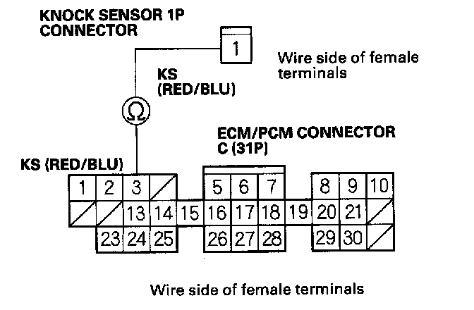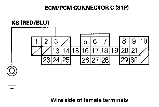 7. Check for continuity between ECM/PCM connector terminal C3 and knock sensor connector terminal No.1.