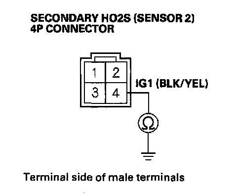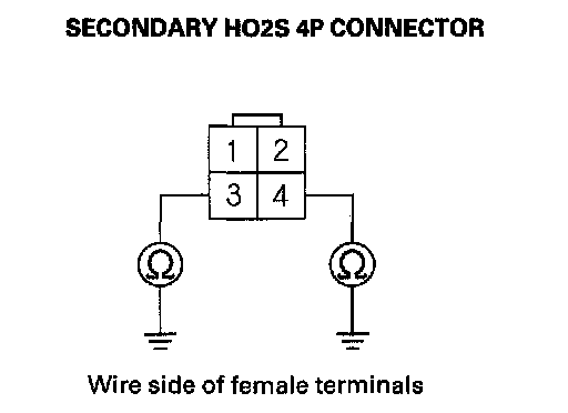 6. Check for continuity between body ground and the Secondary HO2S 4P connector terminals No.3 and No.4 individually.