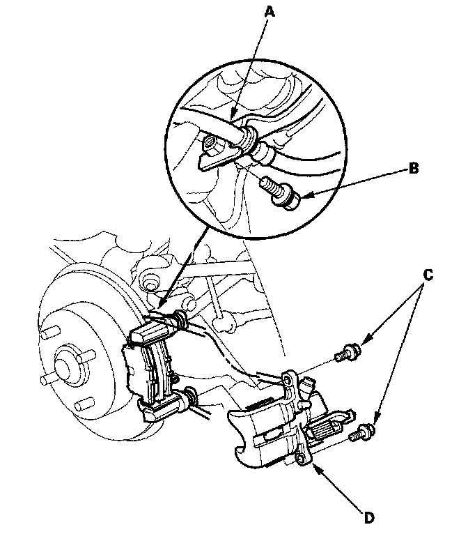 4. Remove the two caliper bolts (C) and caliper (D) from the bracket.