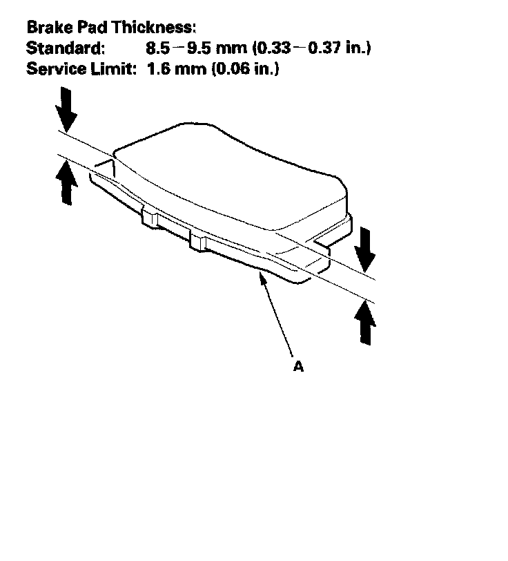 6. Using vernier calipers, measure the thickness of each brake pad lining. Measurement does not include pad backing plate (A) thickness.