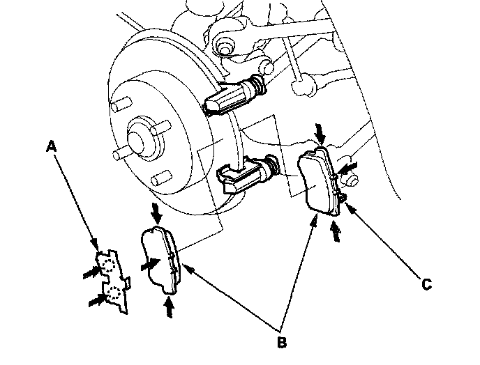 12. Install the brake pads (B) and pad shim on the caliper bracket. Install the inner pad with its wear indicator (C) facing downward.
