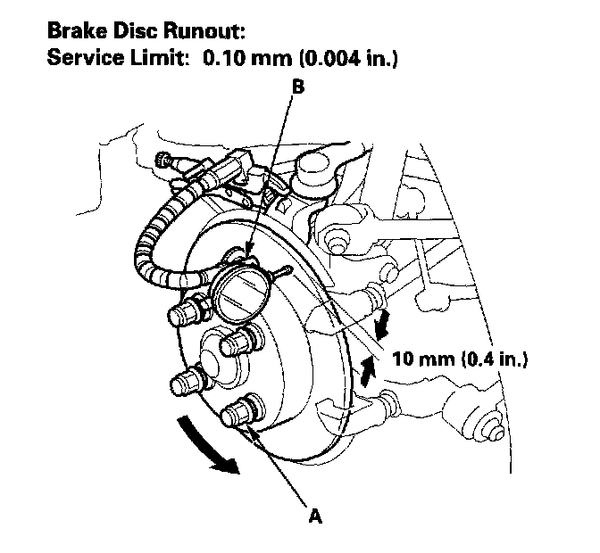 4. Use wheel nuts and suitable flat washers (A) to hold the disc securely against the hub, then mount a dial indicator (B) as shown, and measure the runout at 10 mm (0.4 inch) from the outer edge of the disc.