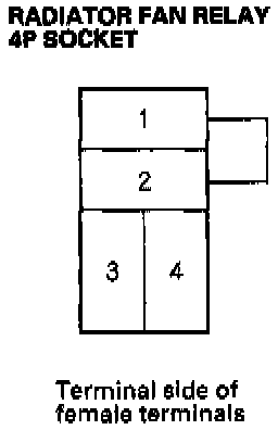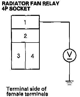 5. Disconnect the jumper, and turn the ignition switch ON (II). Check for voltage between the No. 3 terminal of the radiator fan relay 4P socket and body ground.