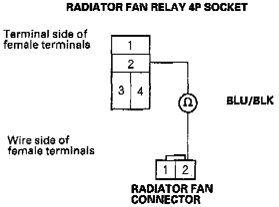 7. Check for continuity between the No. 2 terminal of the radiator fan relay 4P socket and the No. 2 terminal of the radiator fan connector.