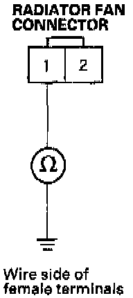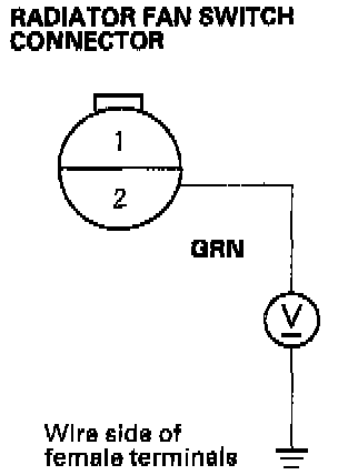 10. Disconnect the radiator fan switch connector. Jump terminals 1 and 2 to see if fan runs.