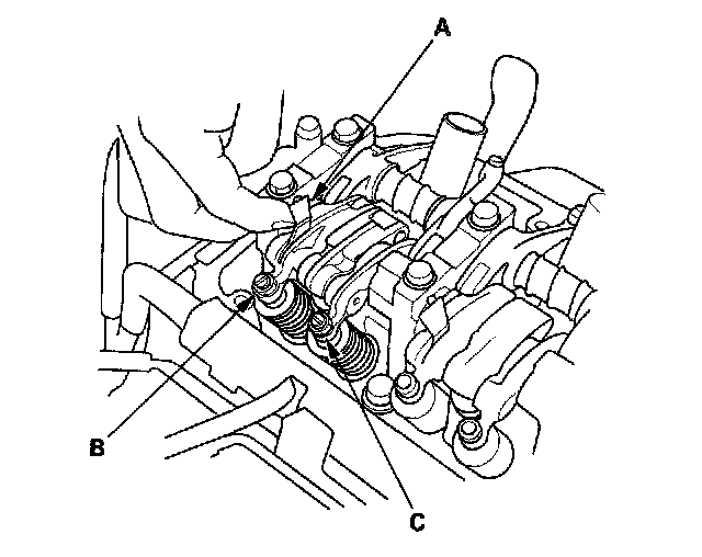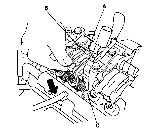 3. Push on the intake mid rocker arm (A) for the No. 1 cylinder. The mid rocker arm should move independently of the intake primary rocker arm (B) and intake secondary rocker arm (C).
