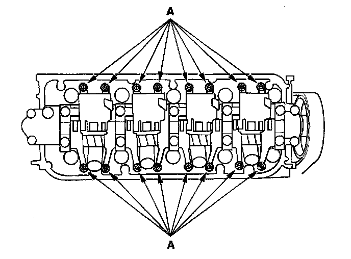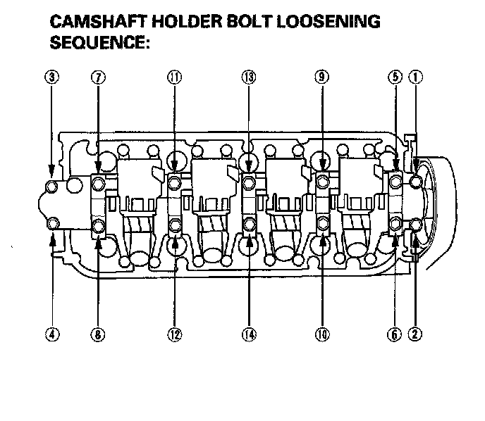 -1 Unscrew the camshaft holder bolts two turns at a time, in a crisscross pattern, to prevent damaging the valves or rocker arm assembly.